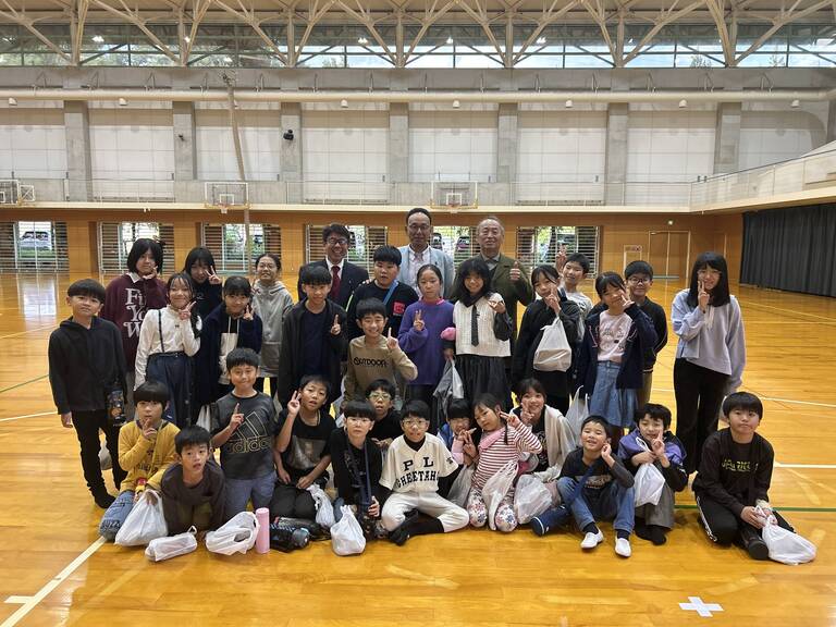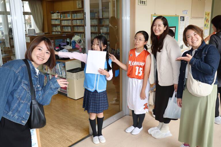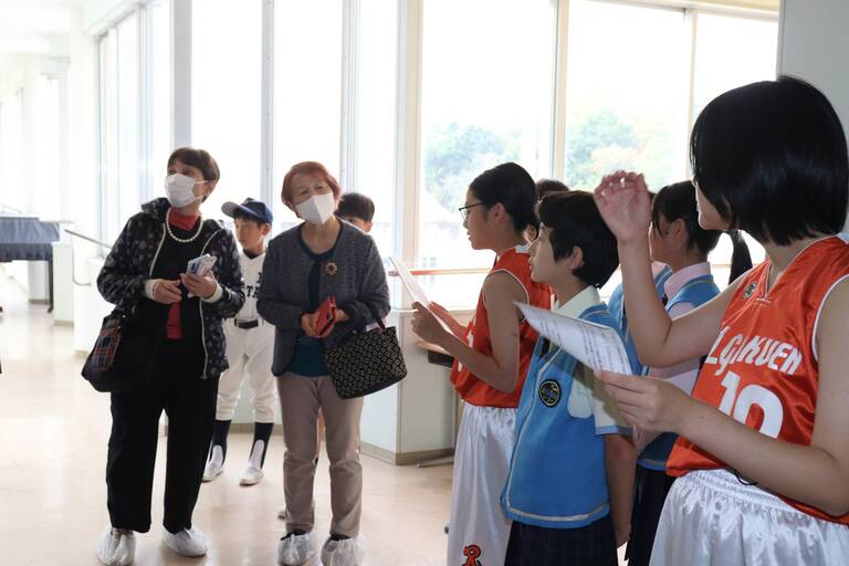 クラブ活動のユニフォームを着て学校案内をしました。